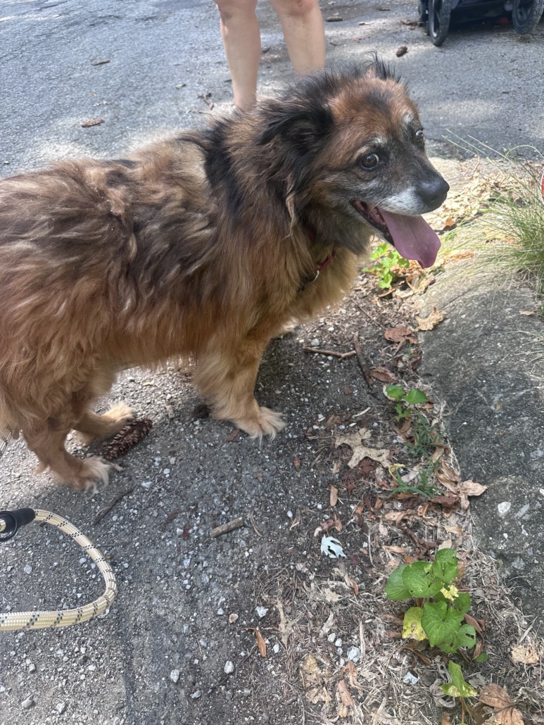 Senior, medium-large fluffy dog, reddish-brown and black coat, possibly Collie/Sheltie mix. Very friendly and sweet. Found in Broad Ripple area.