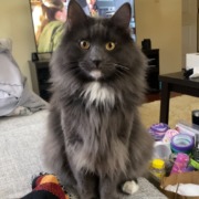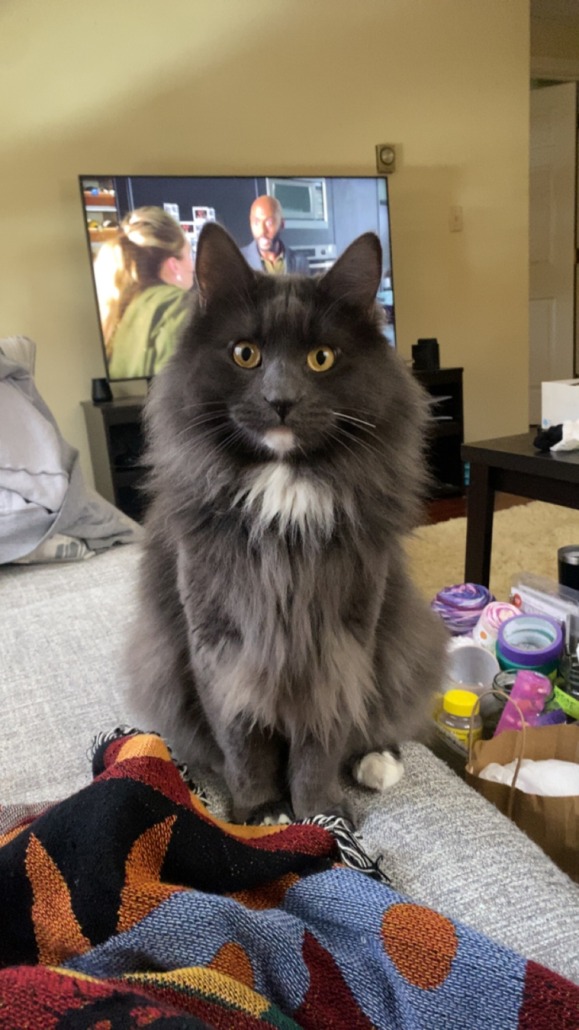 Long haired dark grey cat with white patches on his chin, chest and paws