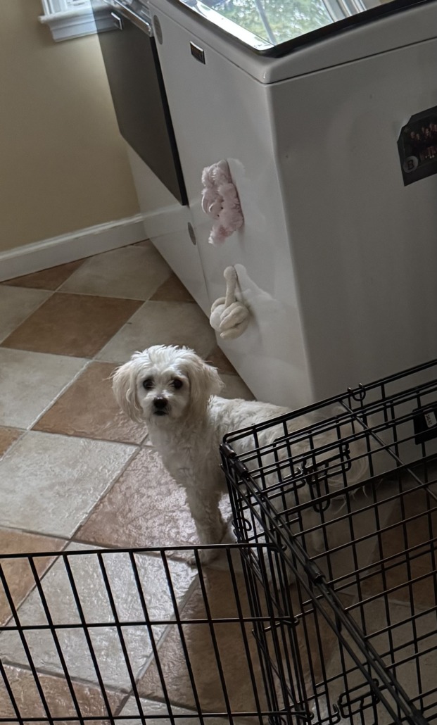 Little white poodle mix, aprox 14 pounds. Very quiet, like to walk on a leash