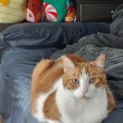 Orange and white. Orange patch on shoulder/arm. Large but not obese. Neutered.