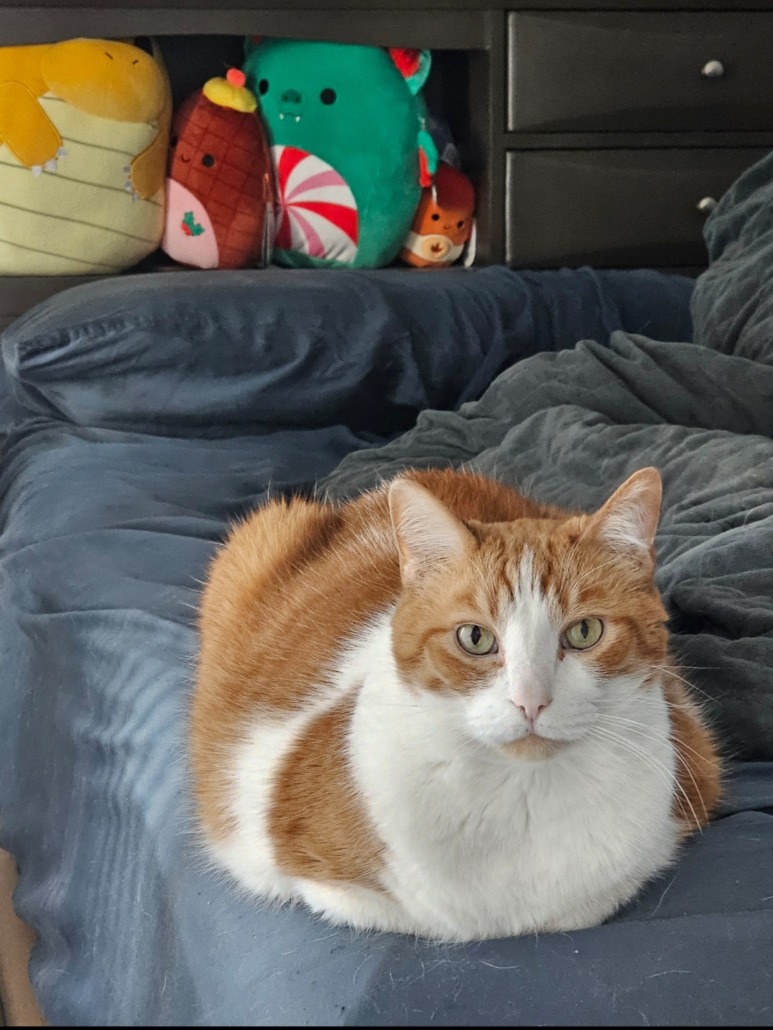 Orange and white. Orange patch on shoulder/arm. Large but not obese. Neutered.