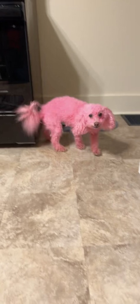 Harper, originally white female but we dyed her pink all over her body. The color is fading so she is light pink and white more so now. She is wearing a collar with a blue tag saying Harper and our old phone number 3174743536 / 2604439837. She is friendly and full of energy