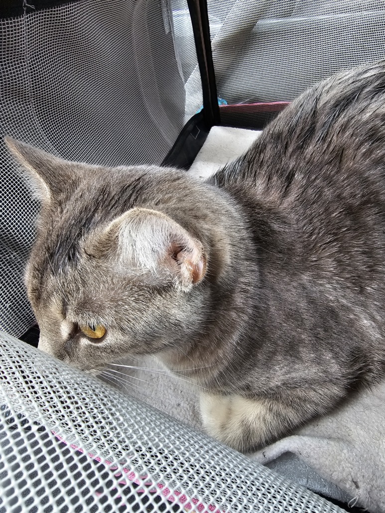 Grey and white tabby. Likely pregnant. Petite and friendly cat. Found next to carrier by the dumpster near Dairy Queen/ Fishers Music and Arts Academy. Working with Hamilton Co Humane Society. Likely there over night or early morning due to cat and carrier wet with patches of dry; not soaking wet. Proof of ownership required.