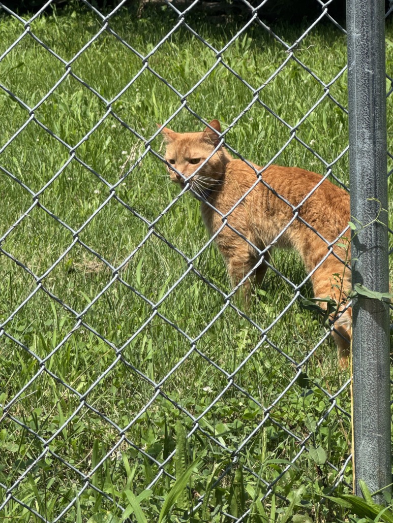 Orange young cat with purple collar, no tags