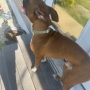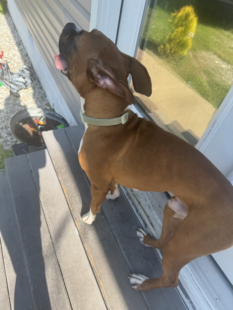 Looks like a brown boxer it is a boy he looks to be either a little over a year or a little under a year definitely a house dog seemed to want to go inside my house unfortunately couldn’t let him in but he is very friendly and hyper has a green collar no tags or numbers to call😢