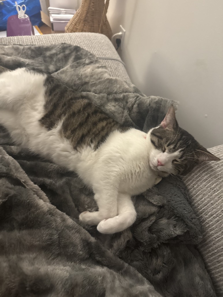 Primarily white on lower body with dark patch on mid back with tiger stripes.