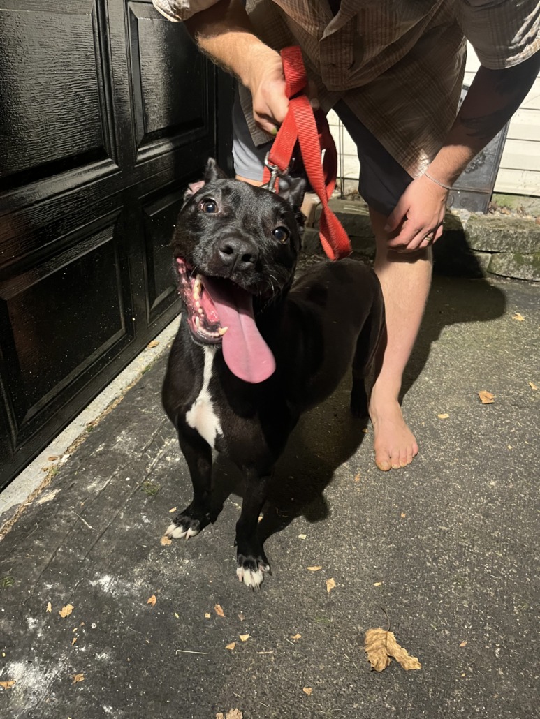 Looks like a male pit mix. Black with a white stripe down his belly, and two front white paws. He’s wearing a red collar with pearls.