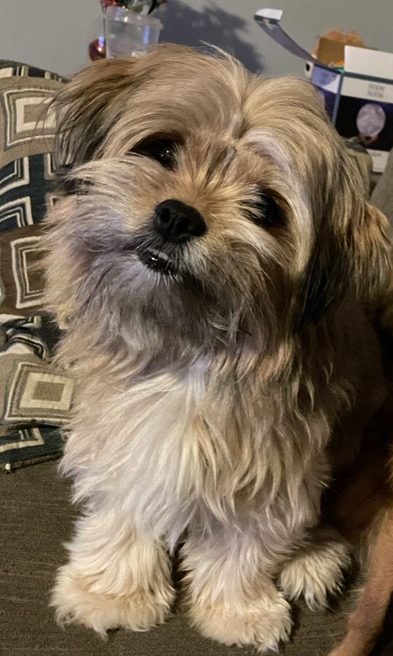 White/tan, fluffy tail, shih tzu/pomeranian mix. She is very sweet and friendly.