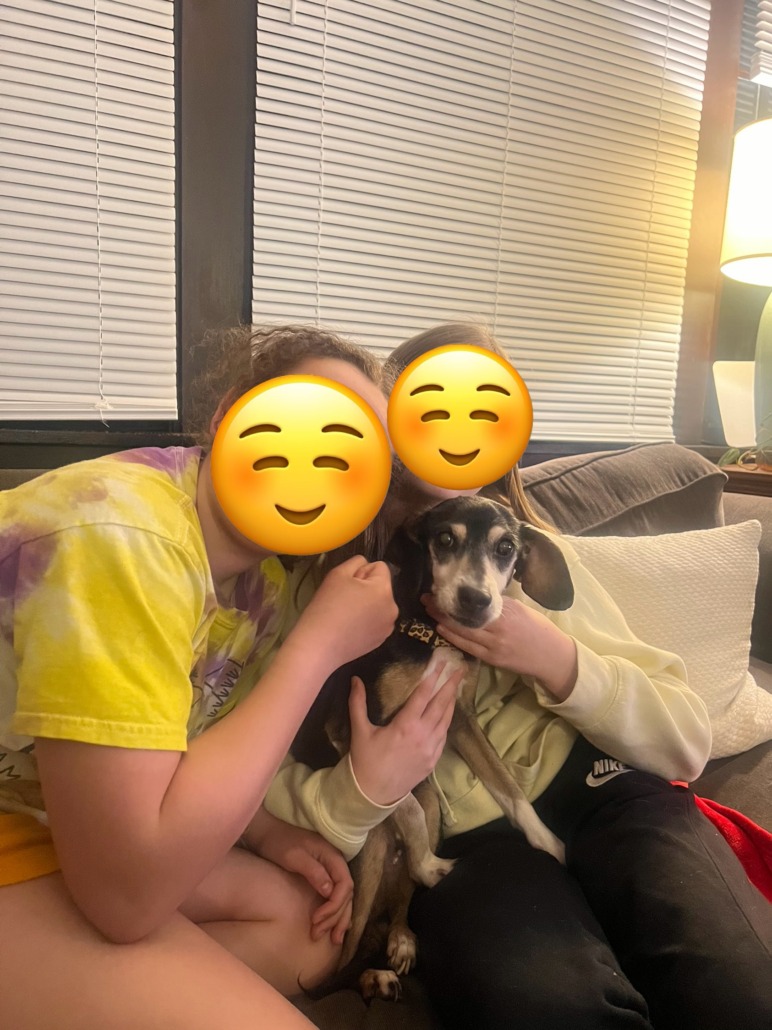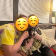 Boo is a senior ( and sick with a large cancerous cyst on her abdomen) She is black with a lot of gray and white. She is 7 pounds give or take and about 1 foot tall. She does not hear well or see well.