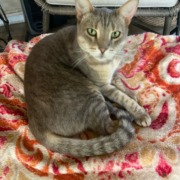 Sam is a skinny, short haired, grey tabby cat. He has green eyes. He has a collar with and AirTag and a normal tag with his name. He is very friendly.