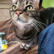 14 YEAR OLD MALE TABBY. MOSTLY black with brown belly. He is a big cat. 12+ lbs He knows his name but might not come to it. He meows but mostly makes a whisper “rrruughh” sound.