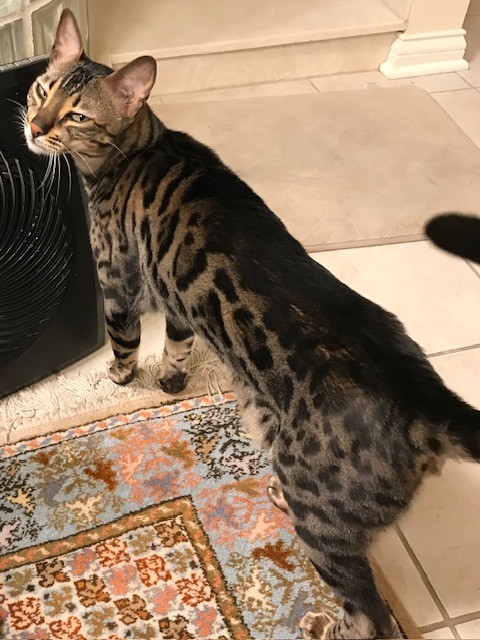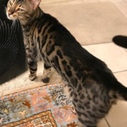 Blaze is a Bengal cat with black spots on his yellowish/black fur. Green eyes.