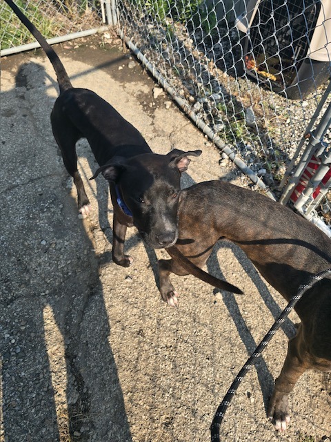 Black male pit picked up at Kroger on Crawfordsville Rd with another dog. No microchips or tags.