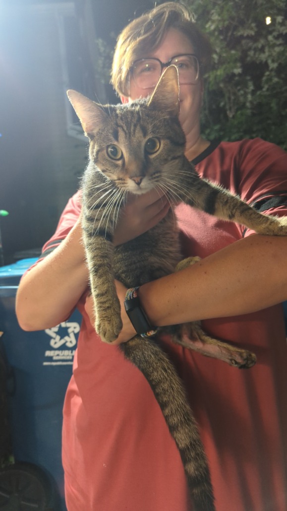 Adolescent male(?) American shorthair tabby, grey. Very friendly and not skittish around people. A little skinny.
