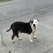 Mama or soon-to-be mama pit bull. Brindle color with white front legs, chest, and neck. Face is mostly white with brindle color on right side of face. Very friendly dog.