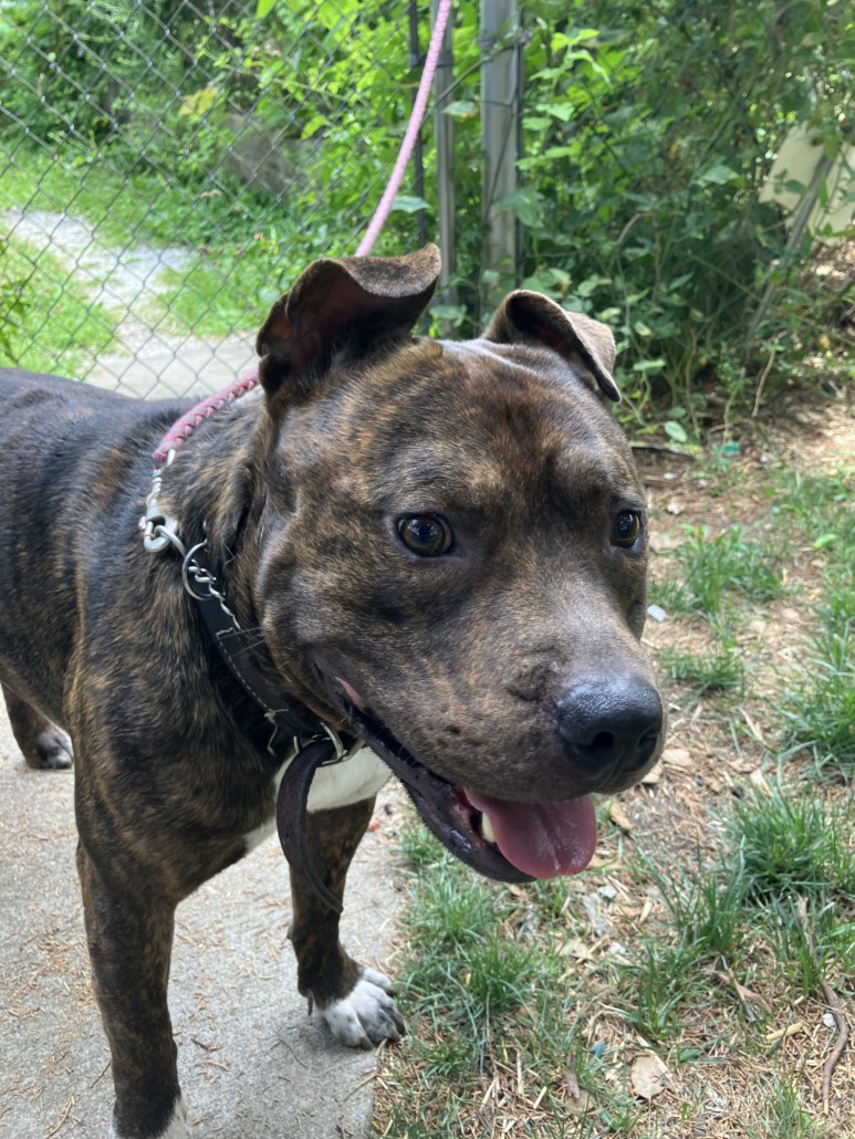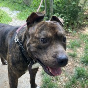 American Bully type dog. Left tied to a bridge in Brookside Park with a leather collar, choker chain and pink braided leash. Intact male. Seems friendly. Likes other dogs and car rides. Crate trained.