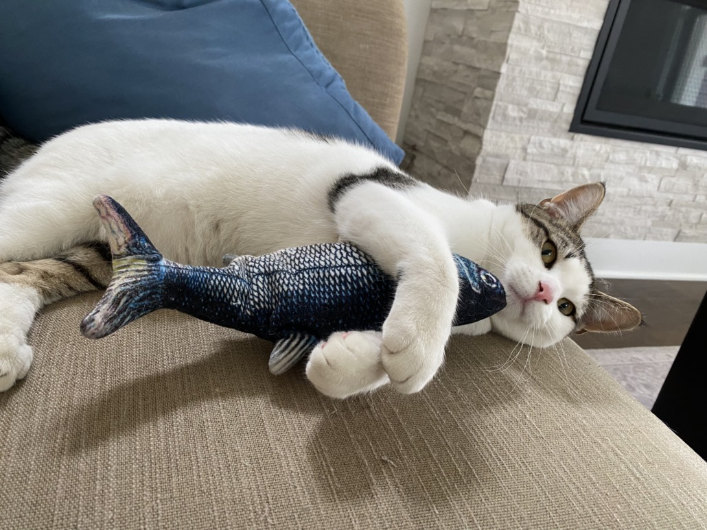 Calving is mostly white but has a tabby head and tail with some tabby spots