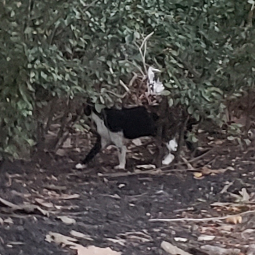 Black and white tuxedo cat. White underbelly and a little black “moustache.” Seen lurking in the wooded area surrounding my property, very skittish