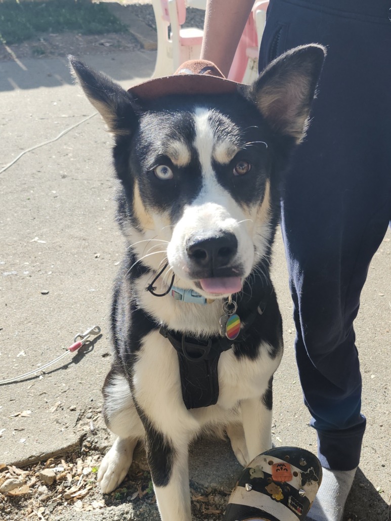 1yr old husky mix with heterochromia. Mostly black, with white and brown. Has anxiety.