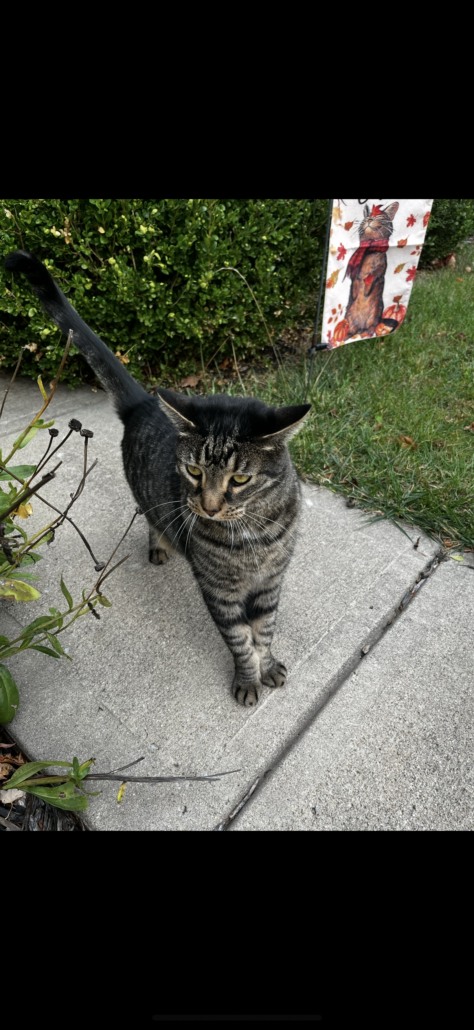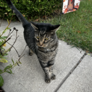 Max is indoor cat that likes to hang out in our backyard when someone is home to let him in. He is friendly but will not go to strangers. Sort of mean look. Have a yellow belly pouch. Had no collar.