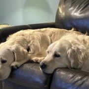 English cream golden retriever by the name of Marc. Wearing a collar but no tags