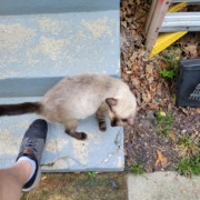 Very pregnant Siamese cat. She is very friendly and is just hanging around my backyard.