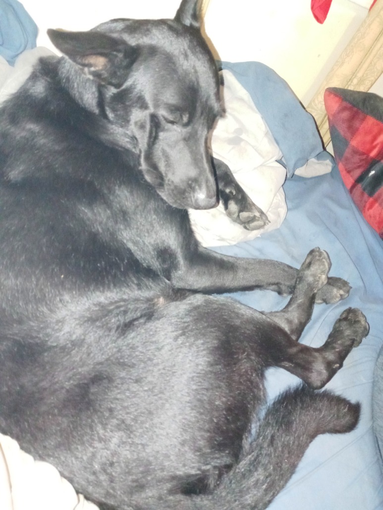 All black with 2 small tuffs of whit fur. This dog is still growing but not a puppy. He also has a curl at the bottom of his tail.