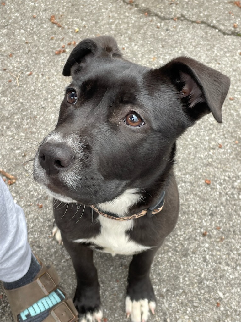 Appx 3 month old was found on neighbors front porch last winter. She is mixed breed, mostly black with some white. Very happy pup that needs a home.Rehoming fee required.