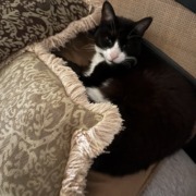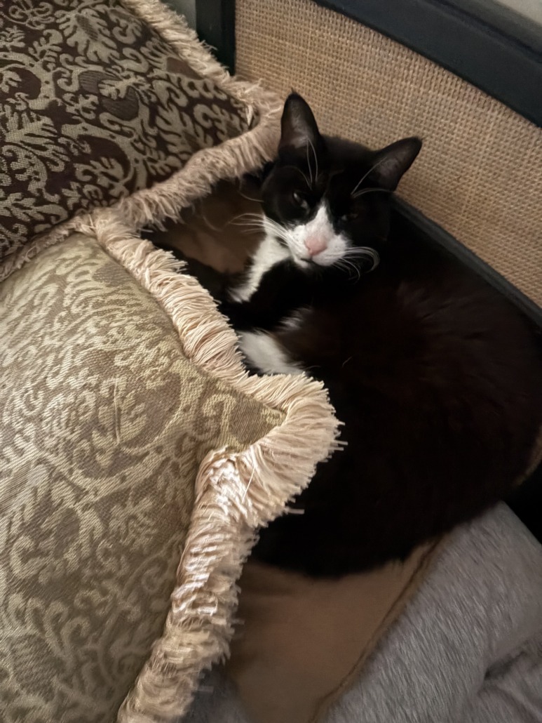 She is a tuxedo cat. All four paws are white, her under body is white. It actually looks like she’s wearing a tuxedo.