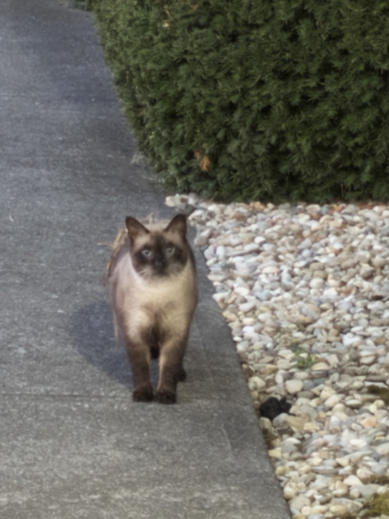 Blue eyes, guessing part Siamese. Dark tail. Was on our front porch. Tried to approach but ran away. Did eat food that was left out.