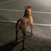 Couldn’t get a good photo while driving, but male pitbull mix with a wide brown leather collar with a dark green nylon rope leash attached. Seemed friendly but lost. Was walking northbound toward 10th street from 9th and Chester Ave intersection.