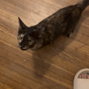 Young lanky female tortoise shell cat with microchip. Very friendly; followed us to car