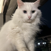 She is a long haired, all white cat with one green and one blue eye. She is also mute and so her meow is quiet and raspy.
