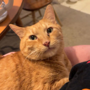 Orange cat with light orange striping. Prefers females or males but is very friendly. Loves attention and very vocal