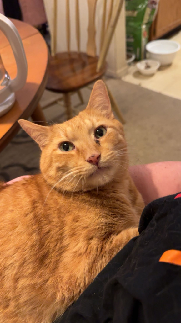 Orange cat with light orange striping. Prefers females or males but is very friendly. Loves attention and very vocal