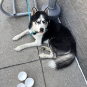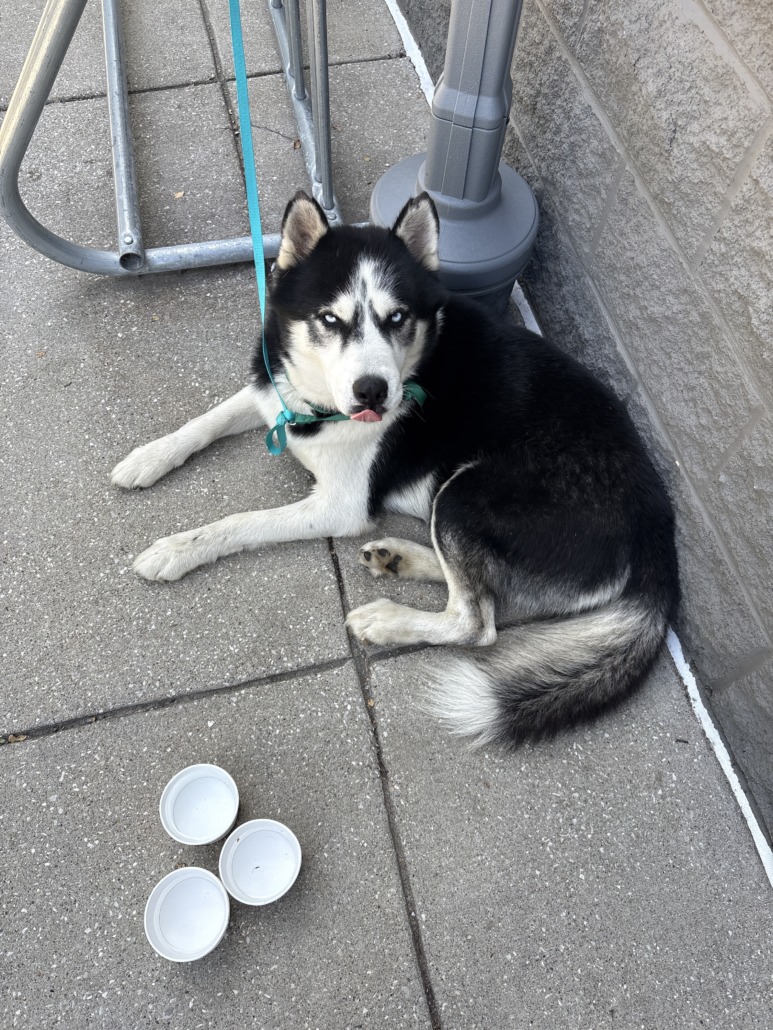 Proof of ownership is required but he is a black and white husky who is very good with people. He seems well fed.