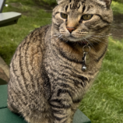 Jacques is a large striped cat and yellow/green eyes. He has a red collar with a metal tag that says “The Legend” on it. He is an older can but roams outdoors and is very friendly. He often hides under porches and decks.