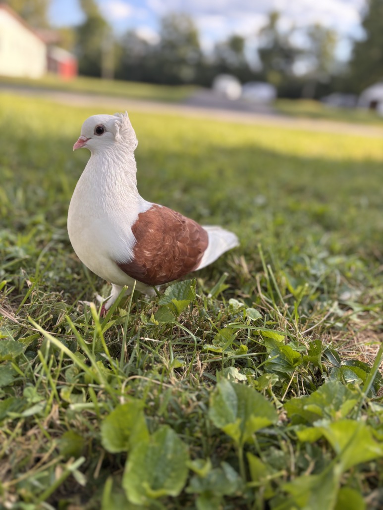 White bird with brown wings. Very friendly with people and dogs. Has not left my porch or roof in about 2 hours. Seems like it’s someone’s pet or somehow has at least been taking care of it.
