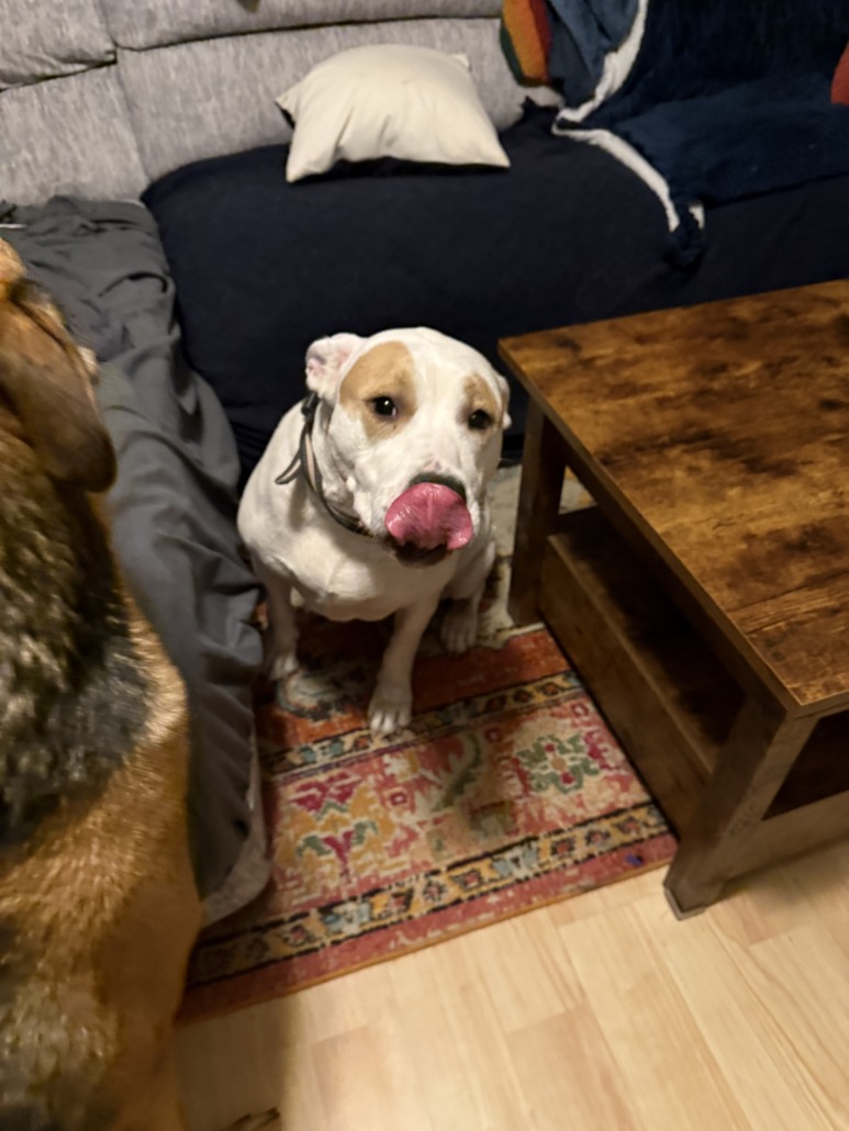 Found female pit or pit mix. Seems very friendly (came right inside) she has an E collar on but no identification.