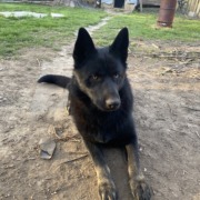 all black husky / german shepard mix. has a white butthole / under tail area. gold ish yellow eyes. friendly ish.