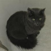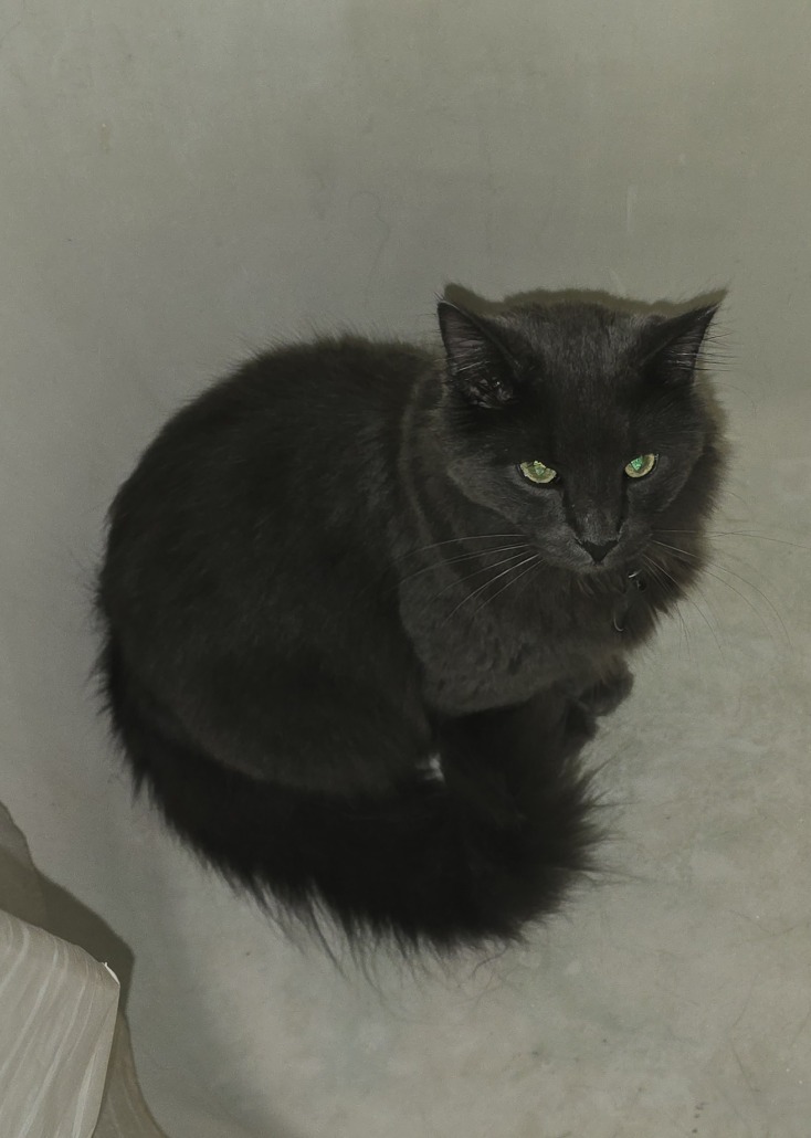 Small grey cat. Had collar on that was a bow tie tag. Super affectionate and playful