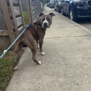 Male pitbull, dog/cat/people friendly. Found wearing brown harness. Proof of ownership required