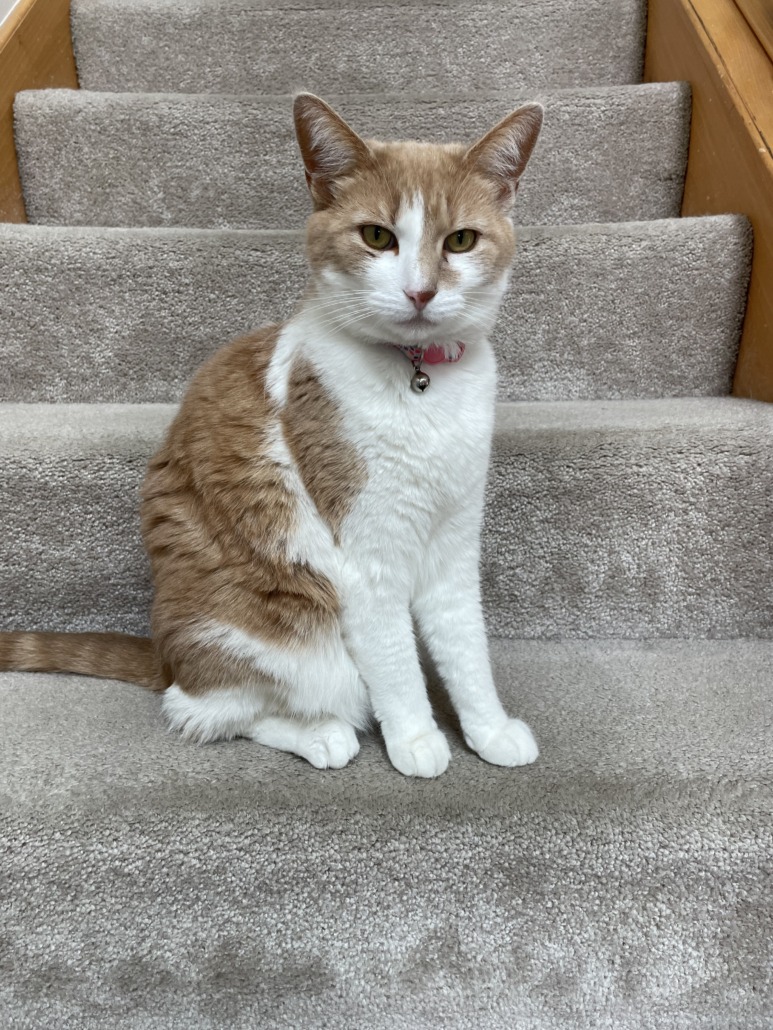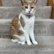 Orange and white female cat, 6 years old. Spayed. Was wearing a worn collar. Friendly, responds to her name (Rosie).