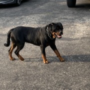 Rottweiler with a chain collar, polite