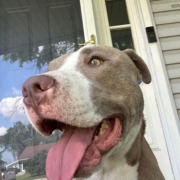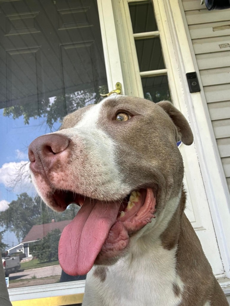 Young neutered male pitbull, white with brown/gray/brindle spots, named Goomba