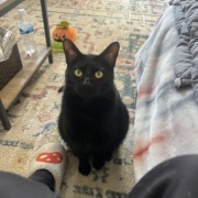 Very sweet and snuggly but also very skittish. He talkative and his meow sounds like a kitten still but he’s a very large cat. He is neutered and chipped