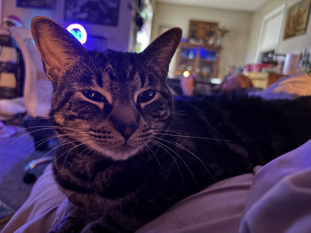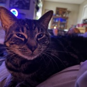 Dark colored tabby, friendly but super shy. Has never known the outside world.