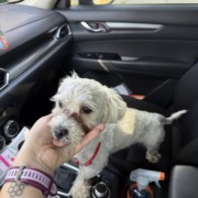 Small white dog with red bracelet on its neck – very playful and fast