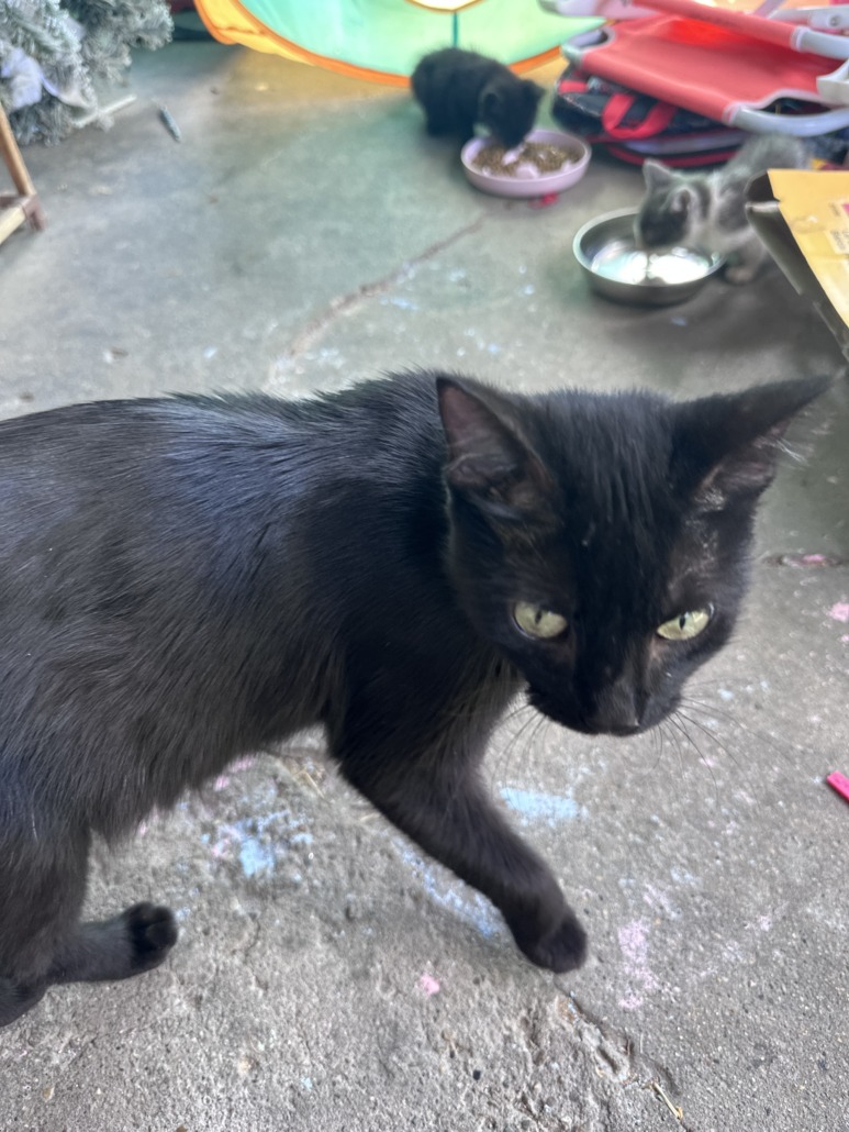 Mama cat is black cat with a white patch on her chest