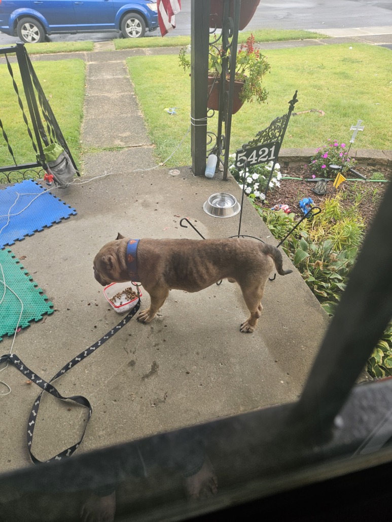 Intact male possibly patties mix. Wearing a color and dragging leash